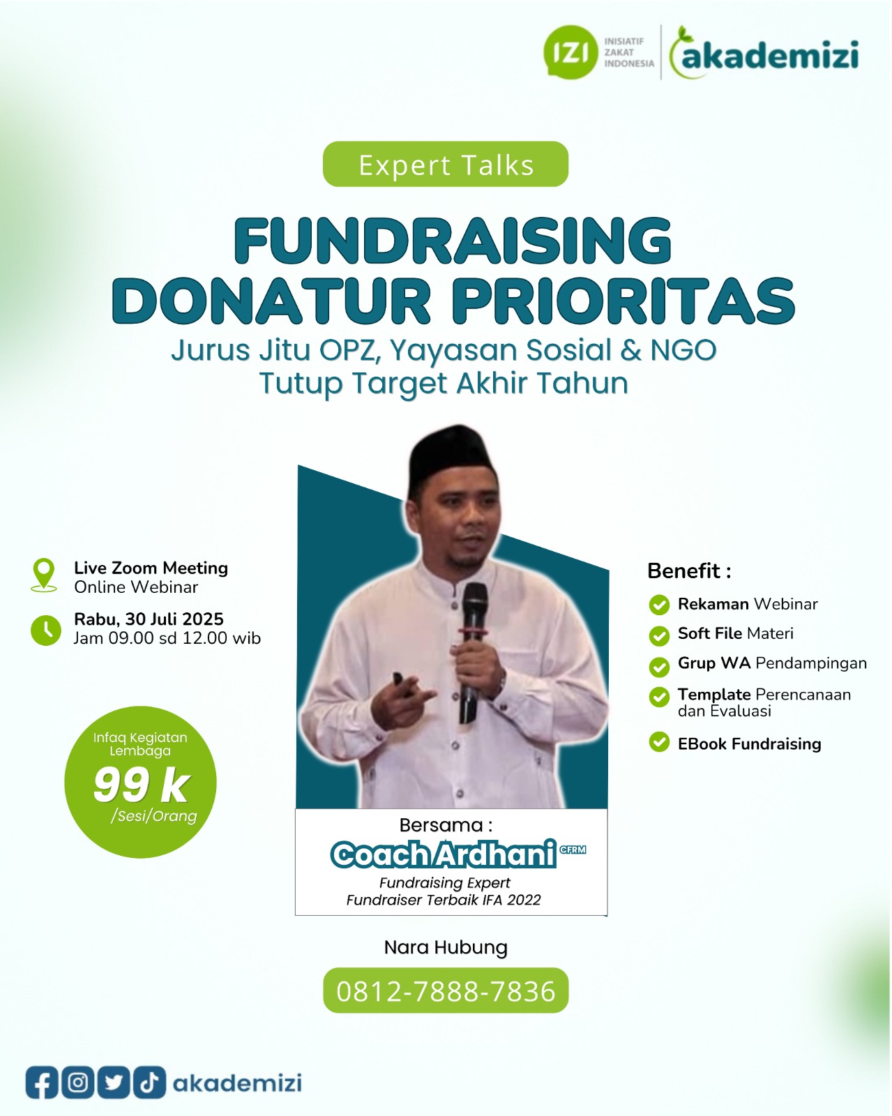 Untuk informasi dan pendaftaran, peserta dapat langsung menghubungi kontak resmi AkademiZI di nomor 0812-7888-7836. Bisa klik di https://lynk.id/akademizi. Jangan lewatkan kesempatan berharga ini, karena keberhasilan fundraising Anda bisa ditentukan oleh strategi yang Anda ambil hari ini!