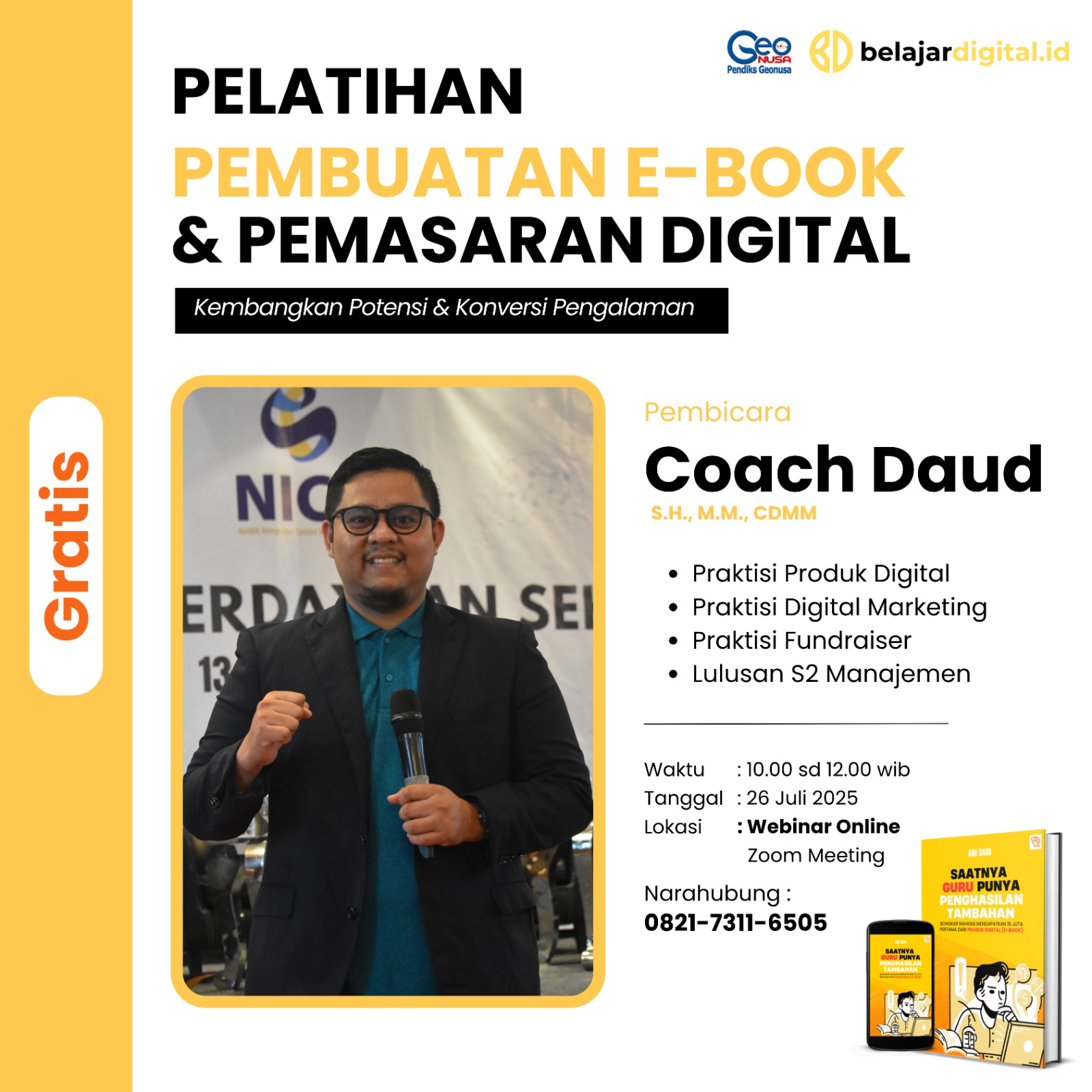 Hadir sebagai narasumber utama adalah Coach Daud, S.H., M.M., CDMM, seorang praktisi digital serbabisa yang telah lebih dari 7 tahun berkecimpung di bidang produk digital, pemasaran digital (digital marketing), dan fundraising. Dikenal dengan pendekatannya yang sederhana namun membumi, Coach Daud telah menjadi mentor bagi ratusan peserta yang kini telah berhasil menerbitkan dan memasarkan e-book mereka sendiri.