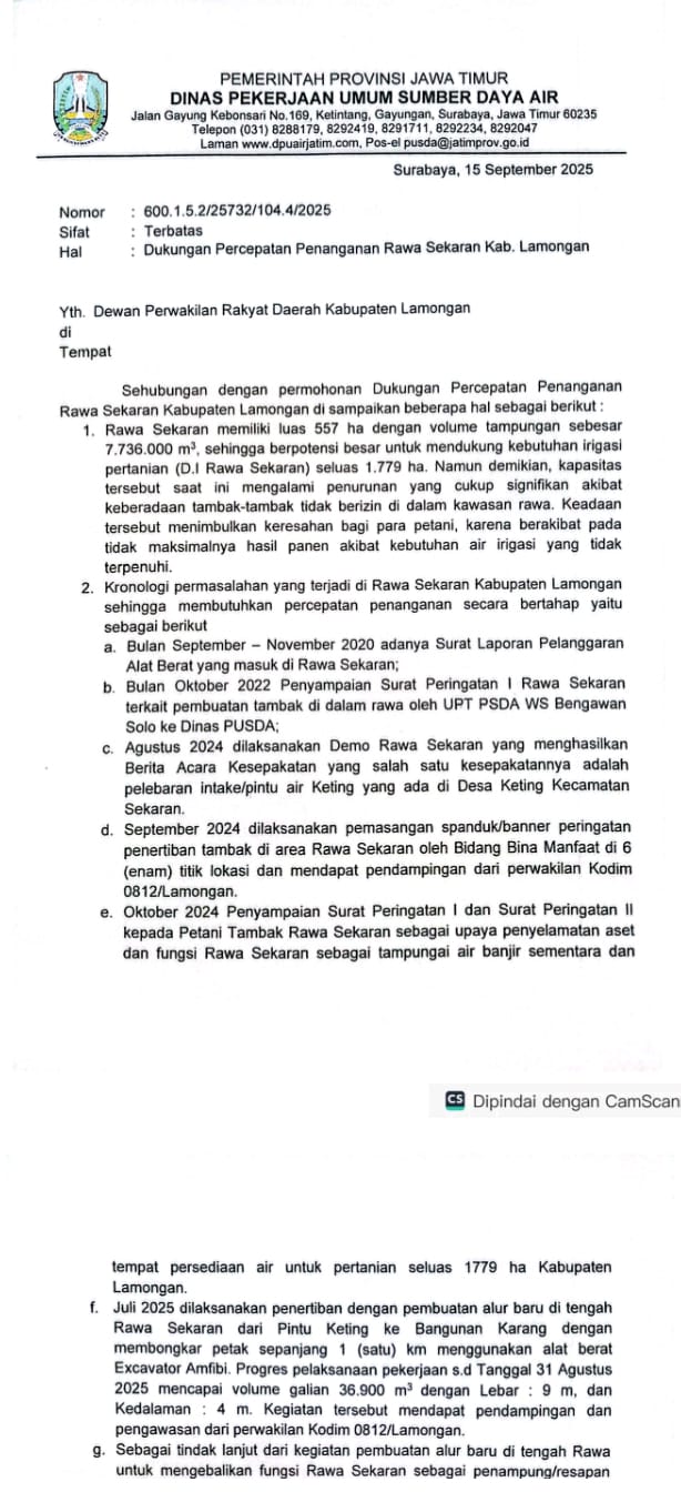 Normalisasi kawasan rawa dinilai penting untuk mendukung program ketahanan pangan nasional. Dengan fungsi rawa yang kembali optimal, sektor pertanian Lamongan diharapkan bisa lebih produktif dan menopang program swasembada pangan.