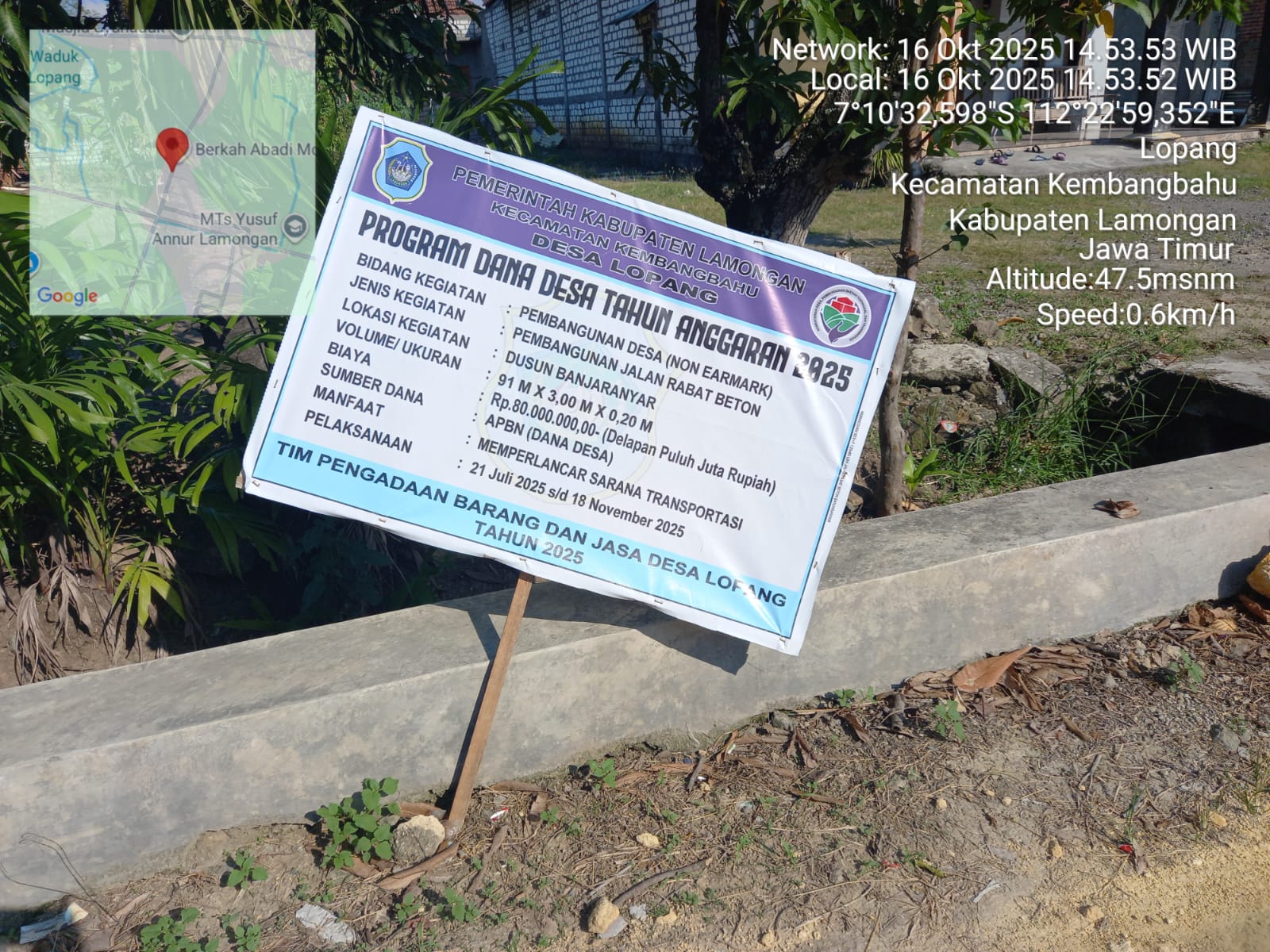 Pengerjaan rabat beton di Dusun Banjaranyar, Desa Lopang, Kecamatan Kembangbahu, Kabupaten Lamongan, menuai sorotan. Proyek yang menggunakan anggaran Dana Desa (DD) tahun 2025 senilai Rp80 juta itu diduga dikerjakan secara kurang profesional.