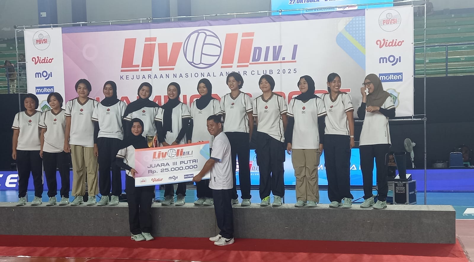 Dalam turnamen yang digelar sejak 26 Oktober hingga 2 November 2025 itu, Tim Bola Voli Putri Mabes TNI tampil impresif dan berhasil mengamankan posisi Juara 3 Nasional setelah menundukkan tim kuat Ganevo Yogya dengan skor telak 3-0 (25-17, 25-21, 25-13).