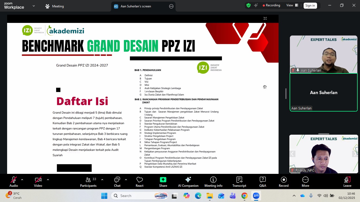 Aan menjelaskan bahwa grand desain PPZ berfungsi sebagai panduan menyeluruh dari hulu hingga hilir, sehingga lembaga memiliki arah yang konsisten dalam pendistribusian dan pendayagunaan zakat. Menurutnya, aspek kebijakan strategis adalah titik awal yang tidak boleh dilewati. Dalam penjelasannya, ia mengatakan bahwa lembaga zakat perlu menetapkan target jumlah mustahik dalam kurun tiga hingga lima tahun ke depan, menentukan rasio serapan anggaran, membagi proporsi anggaran pendistribusian dan pendayagunaan secara jelas, serta memastikan seluruh program memberikan kontribusi nyata terhadap Sustainable Development Goals (SDGs). Tanpa landasan tersebut, lembaga akan sulit mengukur capaian dan mengembangkan program secara terarah.